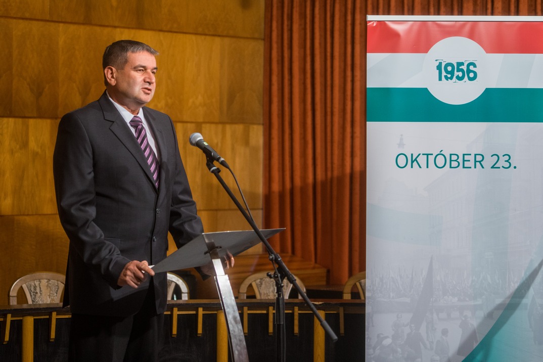 – Azt mondják egybehangzóan történészek, hogy az 1956-os forradalom a világtörténelem egyik legtisztább lelkületű forradalma volt. A harcok során betört kirakatokból a forradalmárok semmit nem vittek el, nem volt fosztogatás. A sebesültek gyógyítására, gyógyszereik megvételéhez utcai perselyeket helyeztek ki, amelyeket esténként ürítettek, de napközben egyetlen forintot sem vitt el belőle senki. Mert ahol tiszták a célok, ott igazak az eszközök és maradandóak a gyümölcsök – hangsúlyozta Szabó Péter.